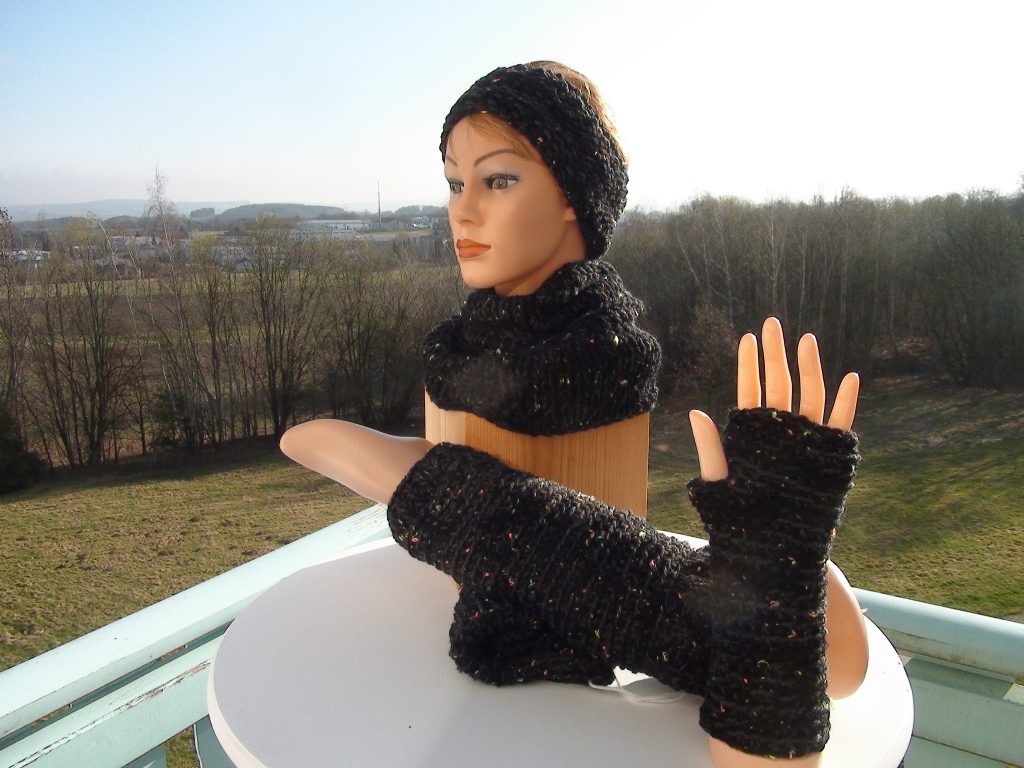 Mützen (teilgefüttert)… Schlauchschales (zwei Mal geschlungen)… Stirnbänder… Armstulpen… Beinstulpen